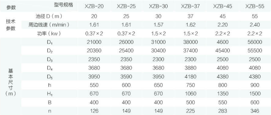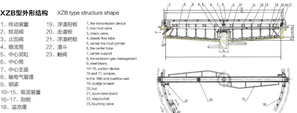 XZB型吸泥機(jī)一般用于大型(一般指流量大于500m3/h) 污水處理工程的幅流式沉淀池,特別適用于二沉池池底污 泥的刮集及外排。池形一般采用中心進(jìn)水、周邊出水、中 心排泥,池底可不設(shè)坡度(平底結(jié)構(gòu)),二沉池使用尤為廣 泛。水面浮渣、浮沫等雜物可由浮渣刮集裝置刮排至池外 渣坑或渣斗。靜壓排泥依靠各個(gè)管口閥門,調(diào)節(jié)流量流至 中心泥缸直接外排。虹吸排泥主要是利用真空泵抽真空進(jìn) 行二次虹吸提升排泥力矩變化范圍較大的場合,可采用帶力矩保護(hù)裝置的軸裝 式減速機(jī)。
